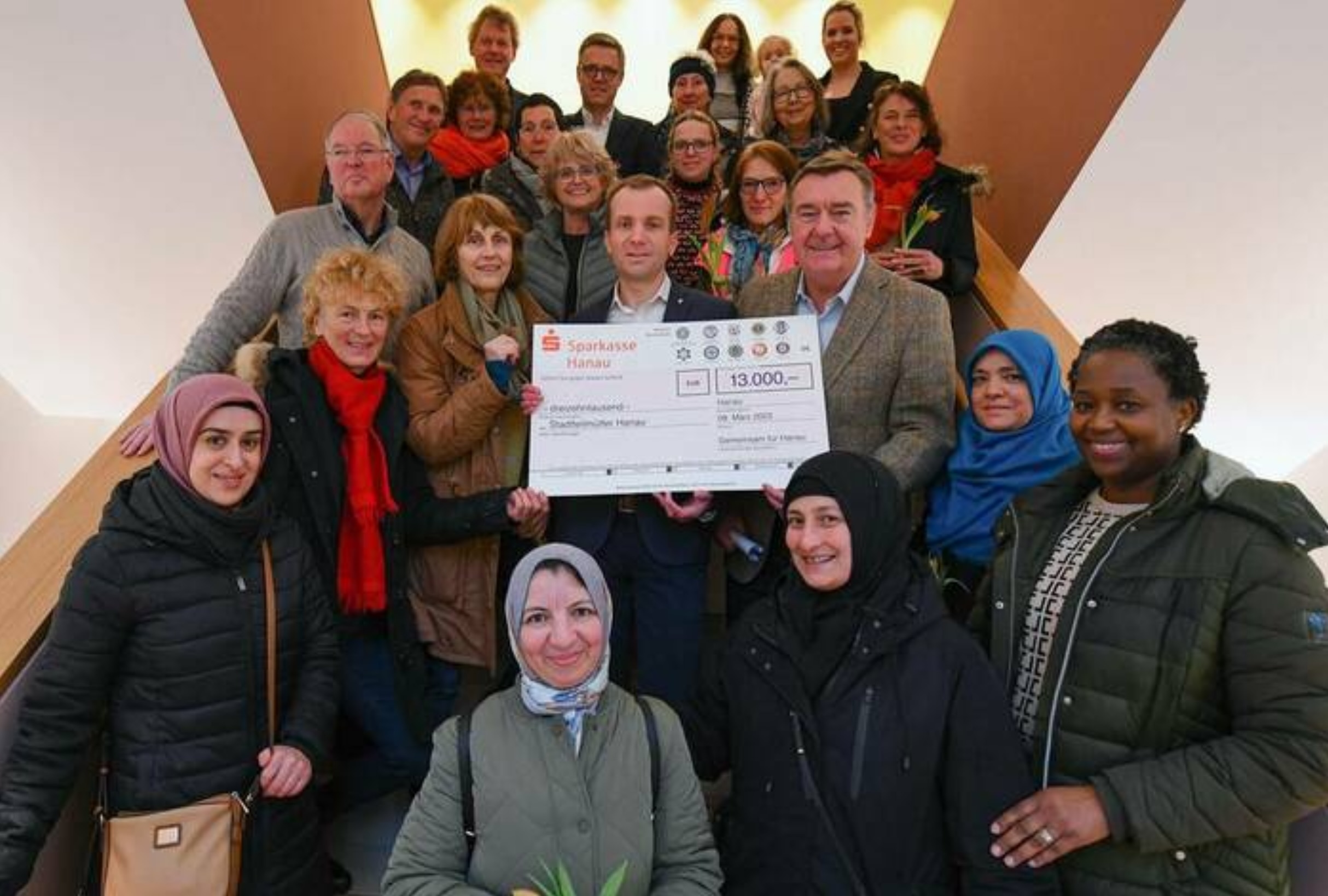 Bei der Übergabe des Spendenschecks an den Trägerverein Sprungbrett Familien- und Jugendhilfe Hanau waren auch zahlreiche Stadtteilmütter anwesend. Foto: Stadt